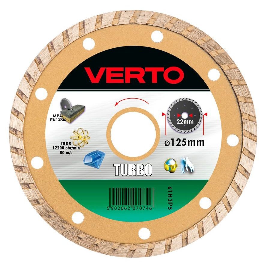 VERTO Turbo diamond disc allows for efficient cutting concrete, reinforced concrete, marble, stone, brick etc. VERTO brand offers power tool and accessories assortment for all DIY enthusiasts.