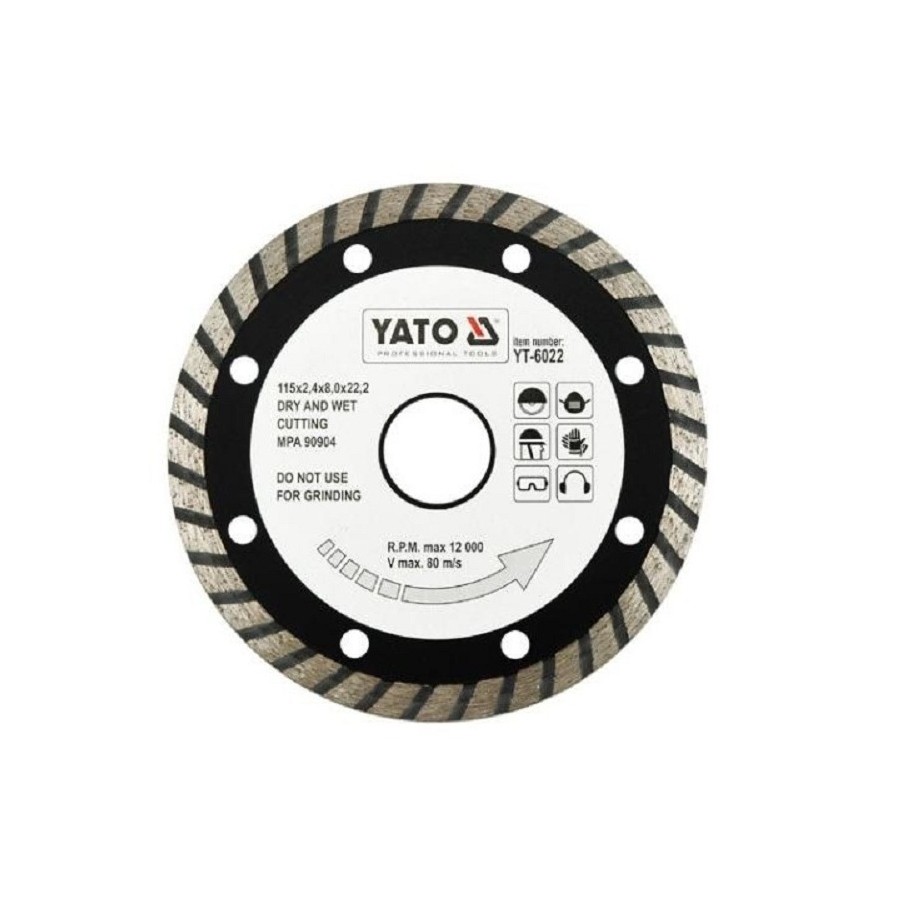 YATO turbo blades cut quicker and cleaner than any other standard diamond discs. These discs can be used on a huge variety of materials, for instance Indian sandstone, ceramic tiles, marble, slate, bricks, flint concrete and many more. These blades can be used wet or dry, depending on the needs. These blades provide a better speed and accuracy than segmented blades. All YATO discs comply with the DIN EN 13236 standard