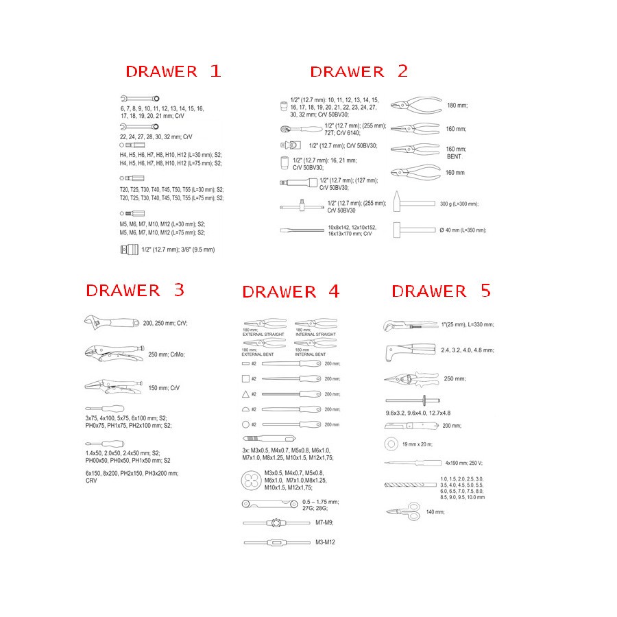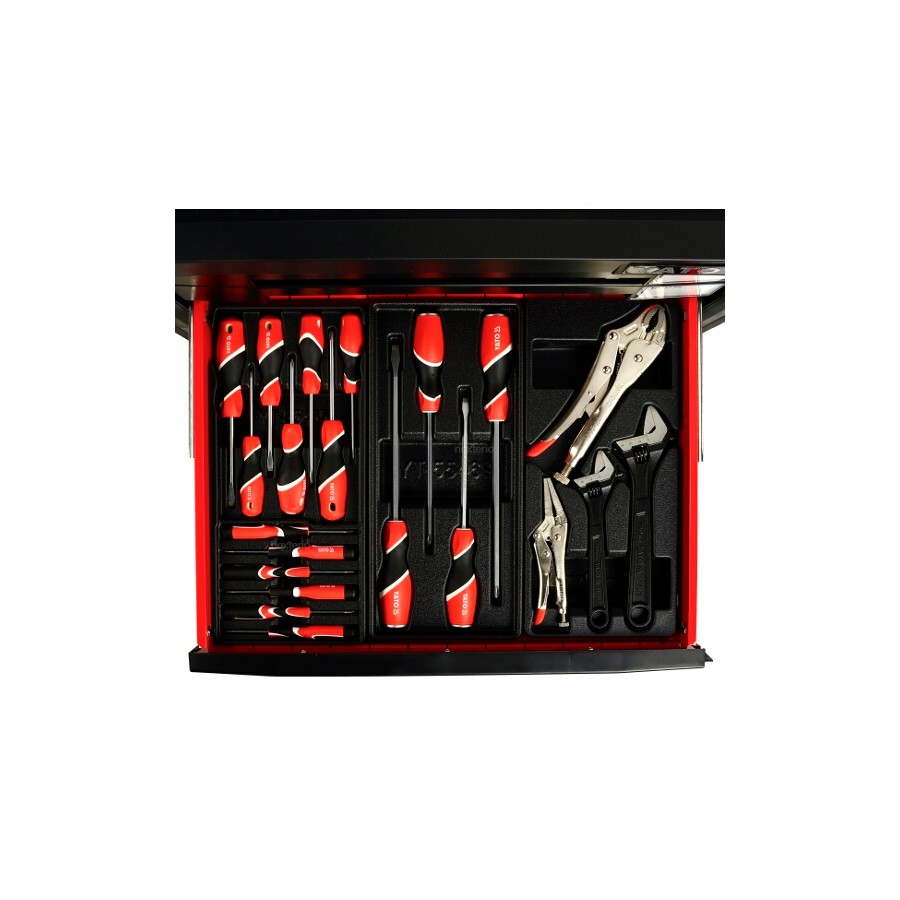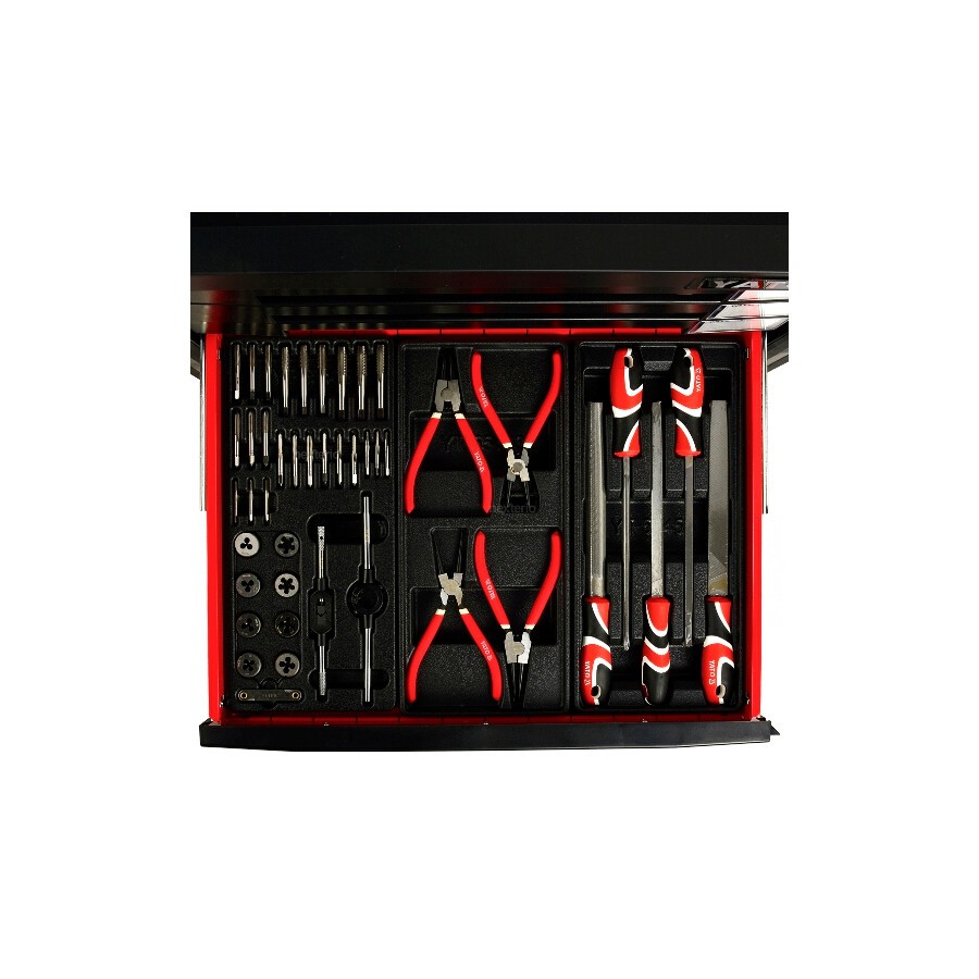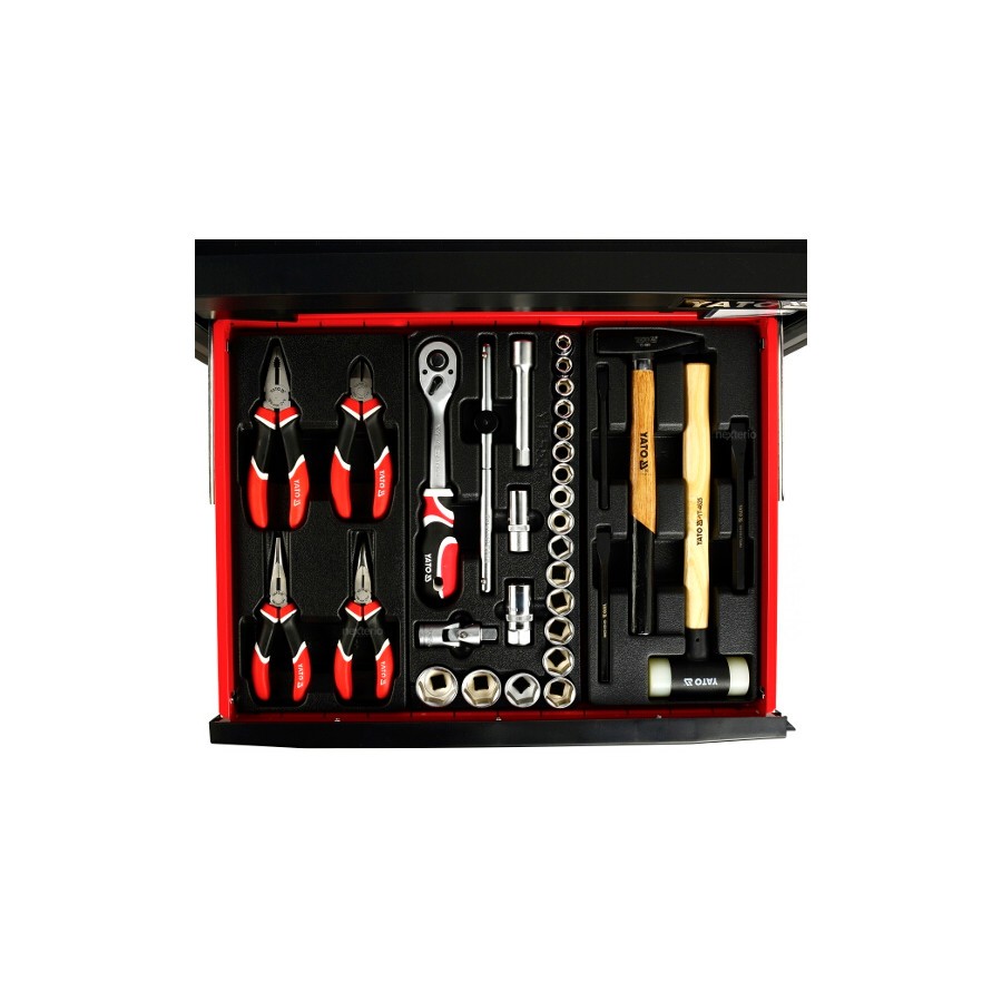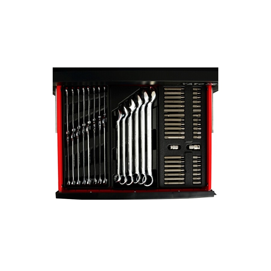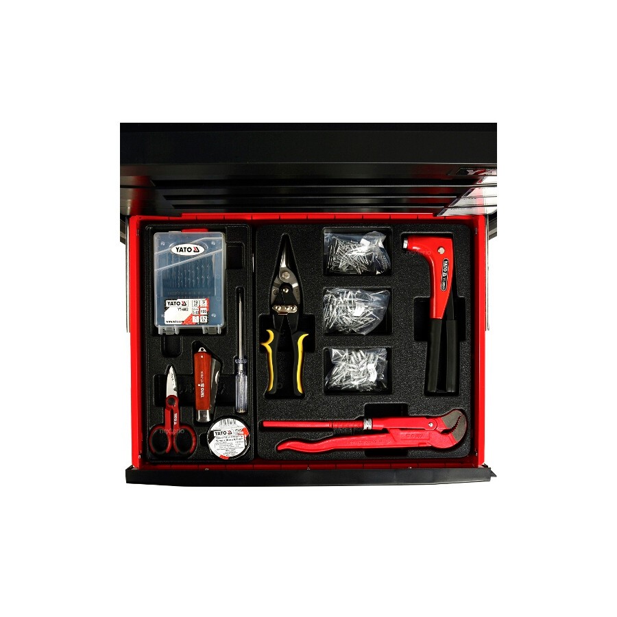 YATO tool cabinet, size 958 x 766 x 465mm. The cabinet is supplied with seven convenient drawers, which have been filled with 189 carefully selected tools. The tools and all the details can be seen at the pictures. Additionally one bigger shelf for large tools all locked with central lock. All drawers have ball guides to confirm long years of reliable operation. An operating top surface is coated with rubber lining resistant to oils and greases. Castors that permit cabinet manoeuvring are equipped with a brake.