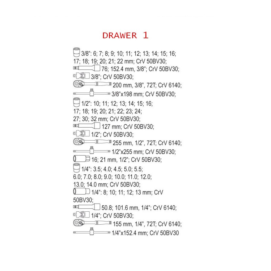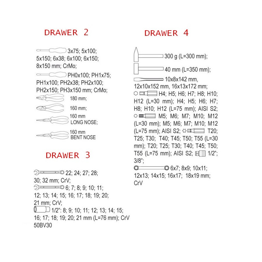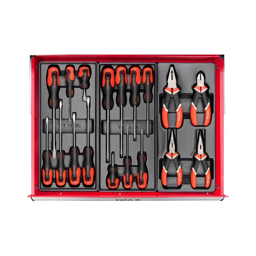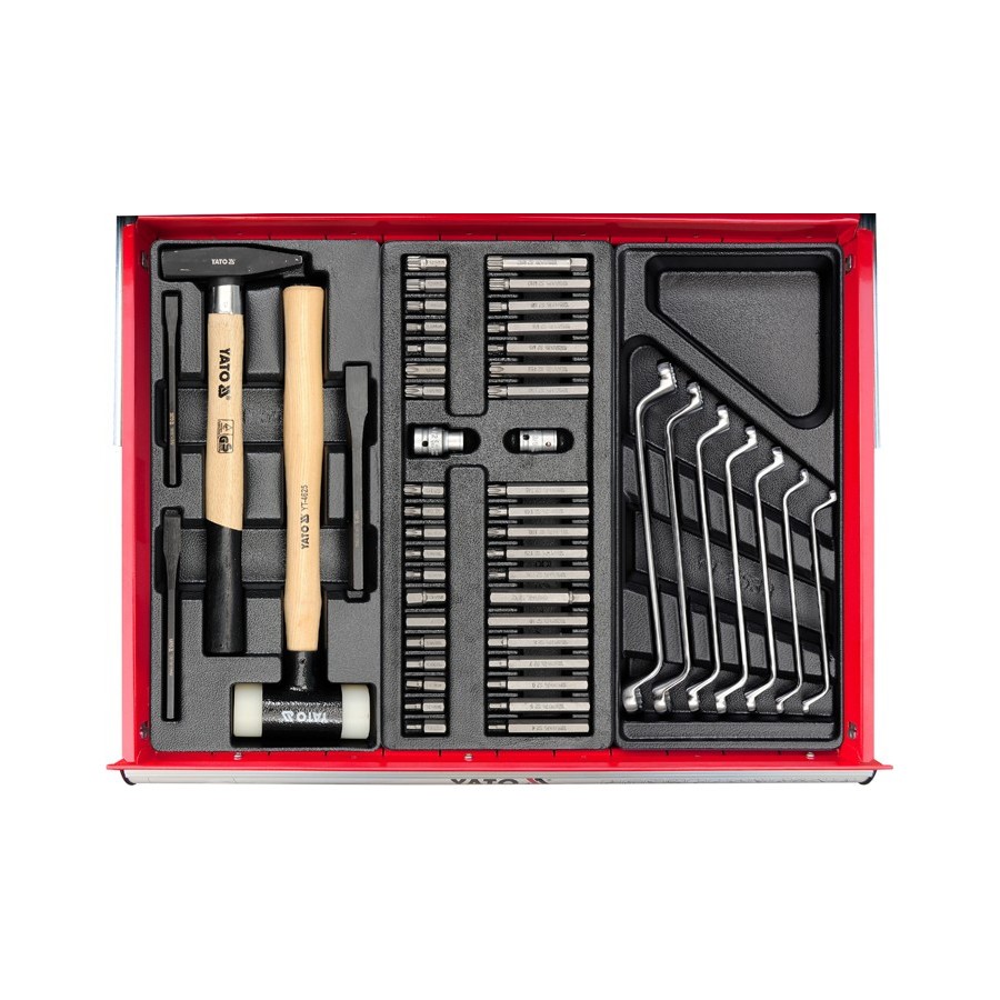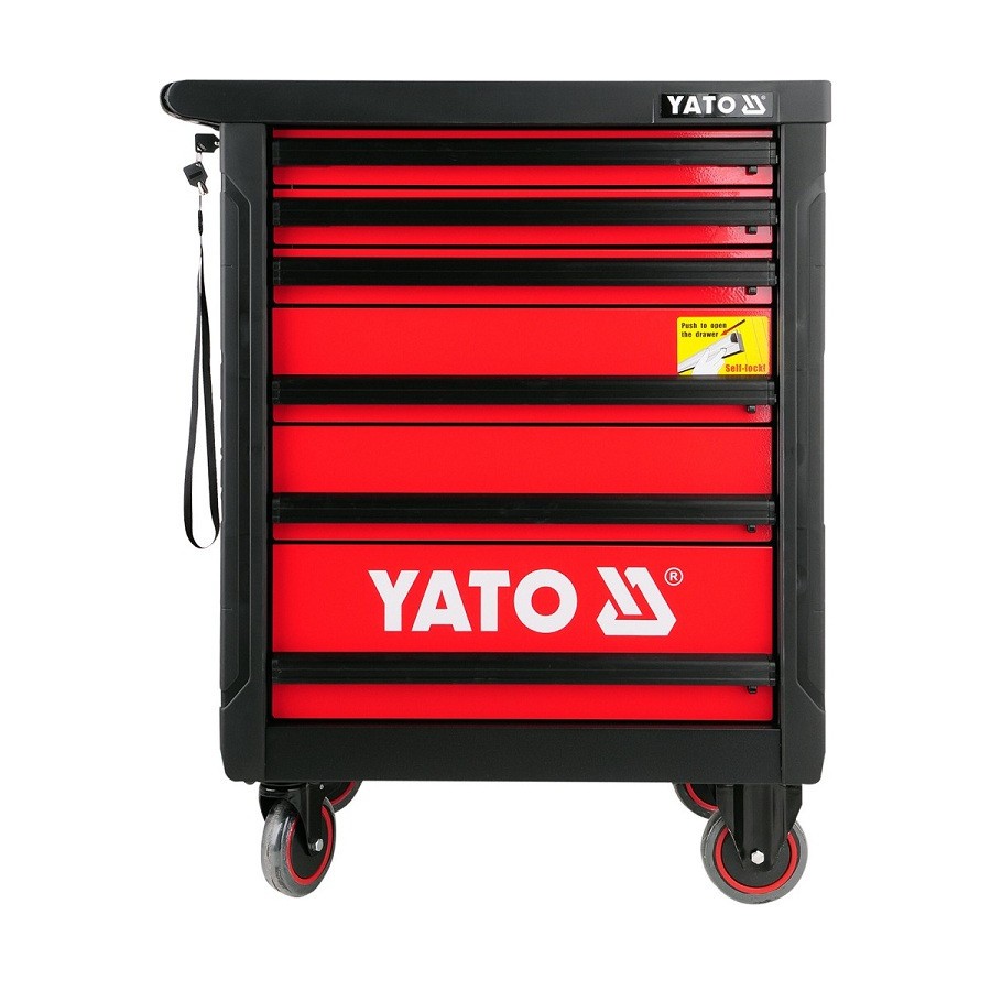 YATO tool cabinet, size 305 x 305 x 145mm. The cabinet is supplied with six convenient drawers, which have been filled with 177 carefully selected tools. The tools and all the details can be seen at the pictures. All locked with central lock. All drawers have ball guides to confirm long years of reliable operation. An operating top surface is coated with rubber lining resistant to oils and greases. Castors that permit cabinet manoeuvring are equipped with a brake.