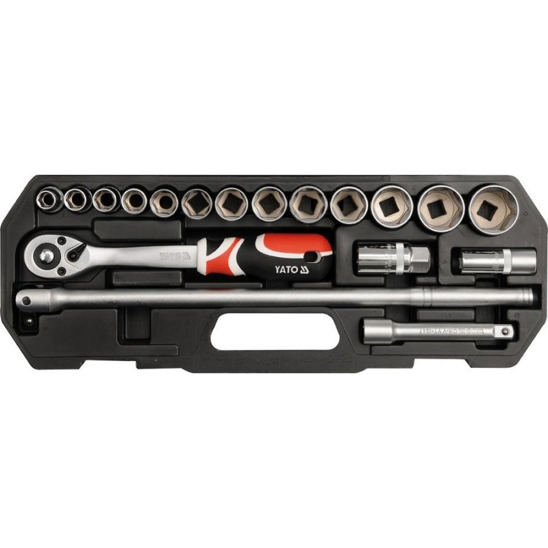 YATO professional socket set 1/2" made from superior quality chrome vanadium steel, which makes it very reliable and long lasting workshop equipment. The set includes a quick release reversible ratchet with a 72 teeth mechanism. The sockets are equipped with an as drive system, which increases its performance by 25%.