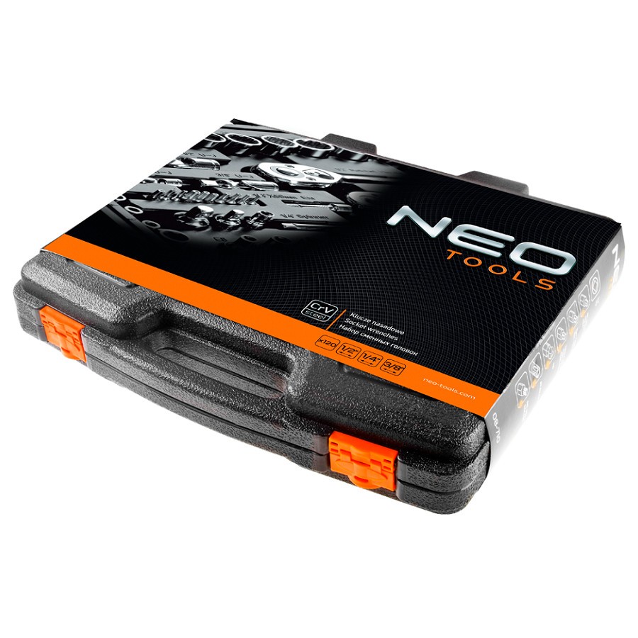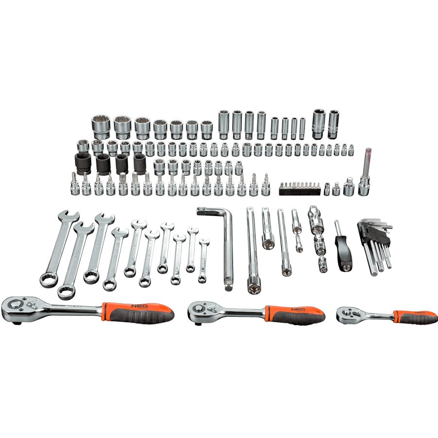 NEO socket wrench set 1/4", 1/2", 3/8" includes 126 pieces made of high-quality chromium vanadium steel. The set contains ratchets, combination spanners and hexagonal keys. The set contains a wide range of sockets (sized 4 to 32 mm) and driver bits (flat, cross, hexagonal, Torx).