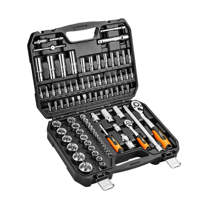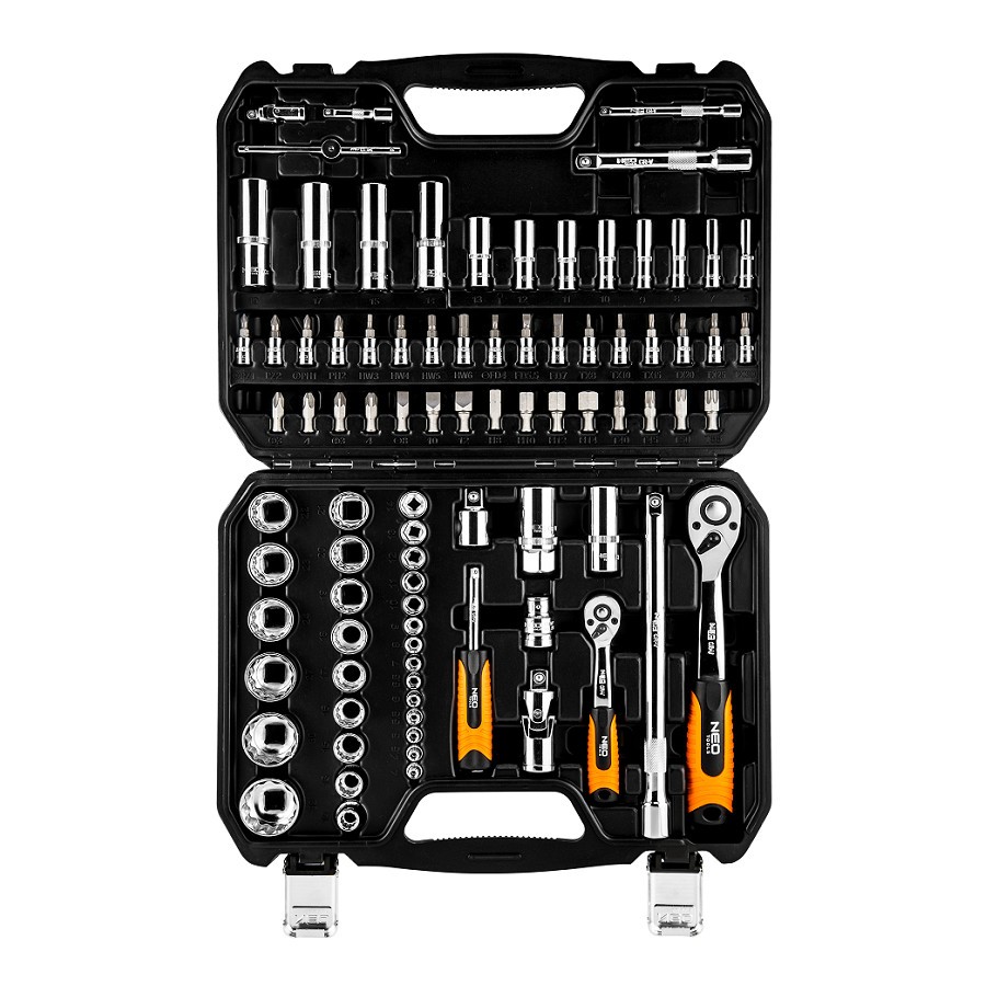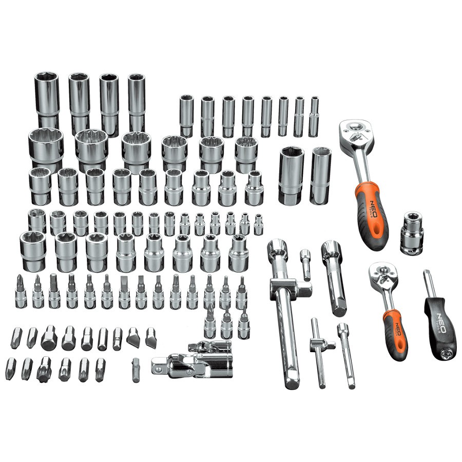 NEO socket wrench set 1/2" and 1/4" includes 86 pieces made of high-quality chromium vanadium steel. The set contains 1/2" and 1/4" ratchets. The set contains a wide range of sockets (sized 4 to 32 mm) and driver bits (flat, cross, hexagonal, Torx).