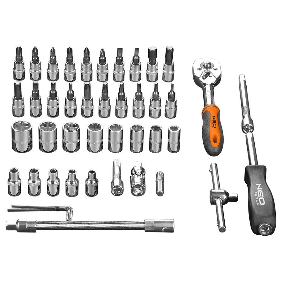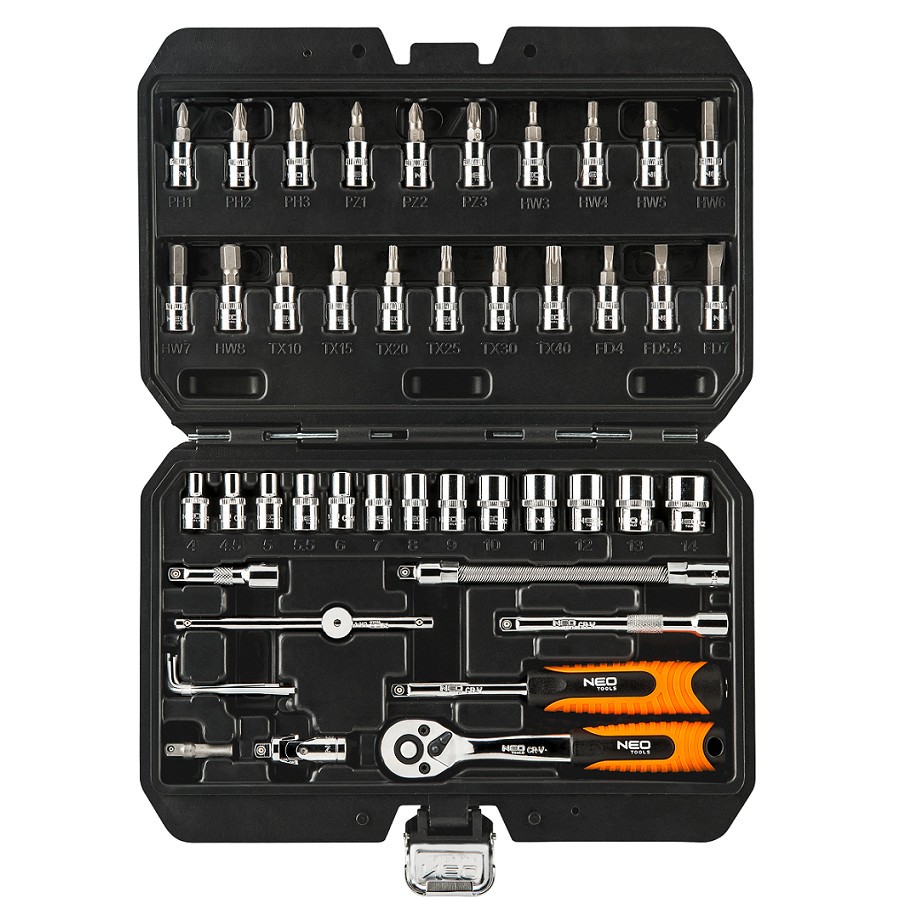 NEO Drive Metric Socket Wrench Set 1/4" includes 46 pieces made of high-quality chromium vanadium steel. The set includes ratchet with a durable ratchet mechanism (72  teeth). The set contains a wide range of sockets (sized 4 to 14 mm) and driver bits (flat, cross, hexagonal, Torx).