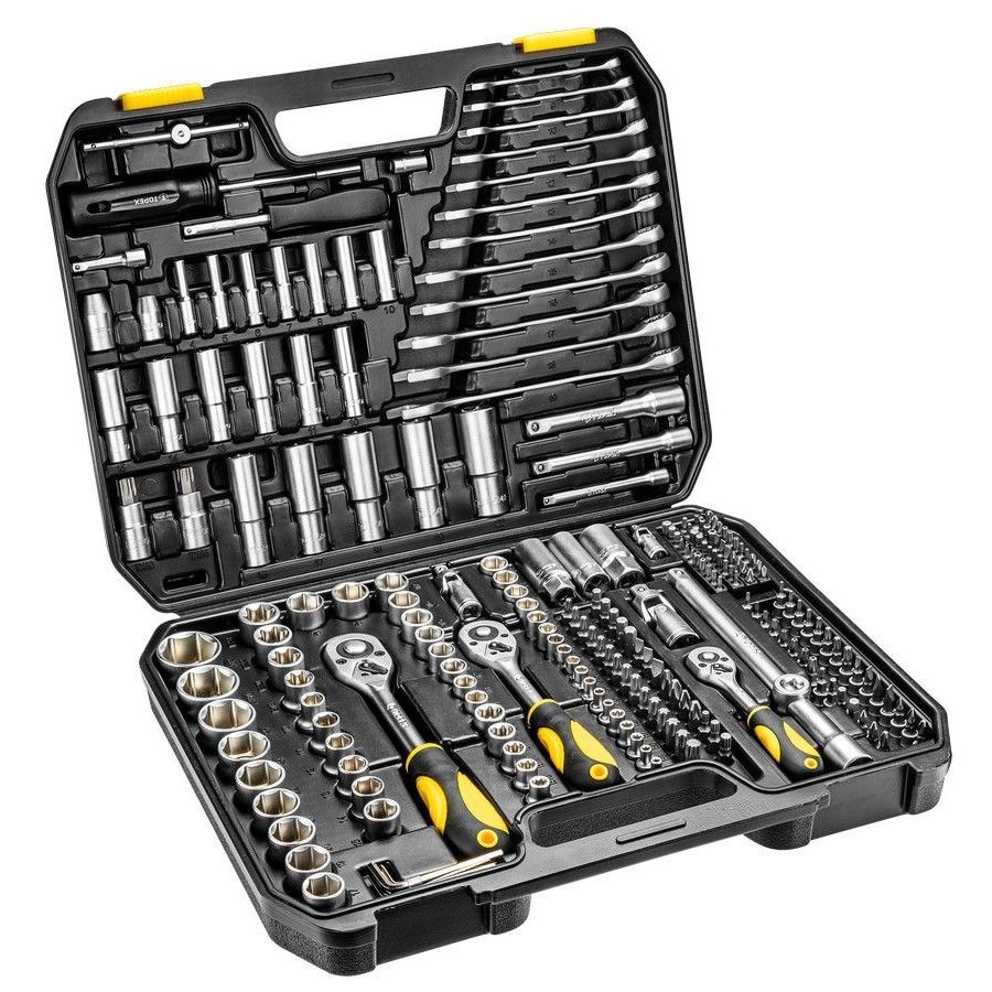 The set contains: hexagonal sockets 1/2" 14 pcs.: 13, 14, 15, 16, 17, 18, 19, 20, 21, 22, 24, 27, 30, 32 mm; long hexagonal sockets 1/2" 5 pcs.: 16, 17, 18, 19, 22 mm, E sockets 1/2" 3 pcs.: E20, E22, E24; spark plug sockets 1/2" 16 mm i 21 mm; extension 1/2”: 125 mm and 250 mm; universal joint 1/2", adapter with hole 1/2", sockets with bits 1/2" H14, T70; ratchet1/2", 45 teeth, combination spanners 12 pcs.: 8, 9, 10, 11, 12, 13, 14, 15, 16, 17, 18, 19 mm; bit holder 1/2", 5/16”; spark plug socket 3/8” 18 mm, hexagonal sockets 3/8” 10 pcs.: 10, 11, 12, 13, 14, 15, 16, 17, 18, 19 mm; hexagonal sockets, long 3/8”, 6 pcs. 10, 11, 12, 13, 14, 15 mm; E sockets 3/8” 6 pcs.: E10, E11, E12, E14, E16, E18; extension 3/8” 125 mm, universal joint 3/8”; bit holder 3/8”, 5/16”; ratchet 3/8” 45 teeth; hexagonal sockets 1/4" 13 pcs.: 4, 4.5, 5, 5.5, 6, 7, 8, 9, 10, 11, 12, 13, 14 mm, hexagonal sockets, long 1/4” 7 pcs.: 4, 5, 6, 7, 8, 9, 10 mm; extension 1/4” 100 mm, extension 1/4" 50 mm, E sockets 1/4", 5 pcs.: E4, E5, E6, E7, E8; universal joint 1/4"; ratchet 1/4", 45 teeth; hex keys, 10 pcs.: 1.27 mm (x2), 1,5 mm (x2), 2 mm(x2), 2,5 mm, 3 mm, 4 mm, 5 mm; 1/4" bit holder; 1/4” screwdriver handle; 1/4" spinner handle; 1/4" socket with bit, 30 pcs. slotted: 4, 5.5, 6.5, 7 mm, PZ0, PZ1, PZ2, T8, T9, T10, T15, T20, T25, T27, T30, TT8, TT9, TT10, TT15, TT20, TT25, TT27, TT30, H3, H4, H5, H6, PH0, PH1, PH2; 30 mm bits, 30 pcs.: TS50, TT40, TT45, TT50, TT55, TT60, MP10, MP11, MP12, MP13, PZ2, PZ3, PZ4, PH2, PH3, PH4, H7, H8, H10, H12, M10, M12, T40, T45, T50, T55, T60, SL8, SL10, SL12; 25 mm bits 44 pcs.: H3, H4, H5, H6, H3 (tamperproof), H4 (tamperproof), H5 (tamperproof), H6 (tamperproof), PH1, PH2, PZ1, PZ2, T8, T10, T15, T20, T25, TT8, TT10 (x2), TT15, TT20(x3), TT25(x2), TT40, M5, M6, M8, slotted 4 mm (2x), 5 mm, 5.5 mm, 6mm, 8mm; TRI-WING 1, 2, 3; TORQ 6, 8, 10, S1, S2, strong and durable case