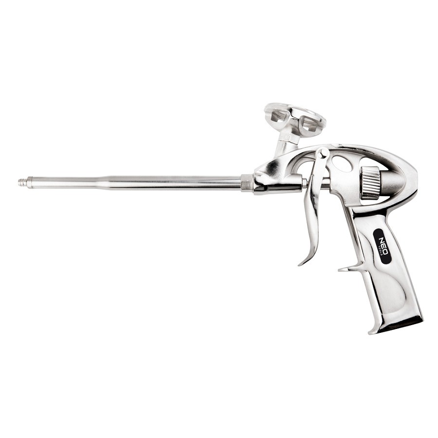 NEO Heavy Duty PTFE Coated Expanding Foam Gun designed for use with standard 500/750ml gun grade Polyurethane pressurised expanding foam canisters. The lightweight nickel plated aluminium body makes it very easy to use. It has Teflon coated needle and canisters fitting valve and a stainless steel barrel, which makes cleaning much easier than otherwise. The gun has a trigger mechanism and flow regulator to ensure a greater control over the foam output. This is a perfect tool for installation of frames and windows, sealing joints and many more
