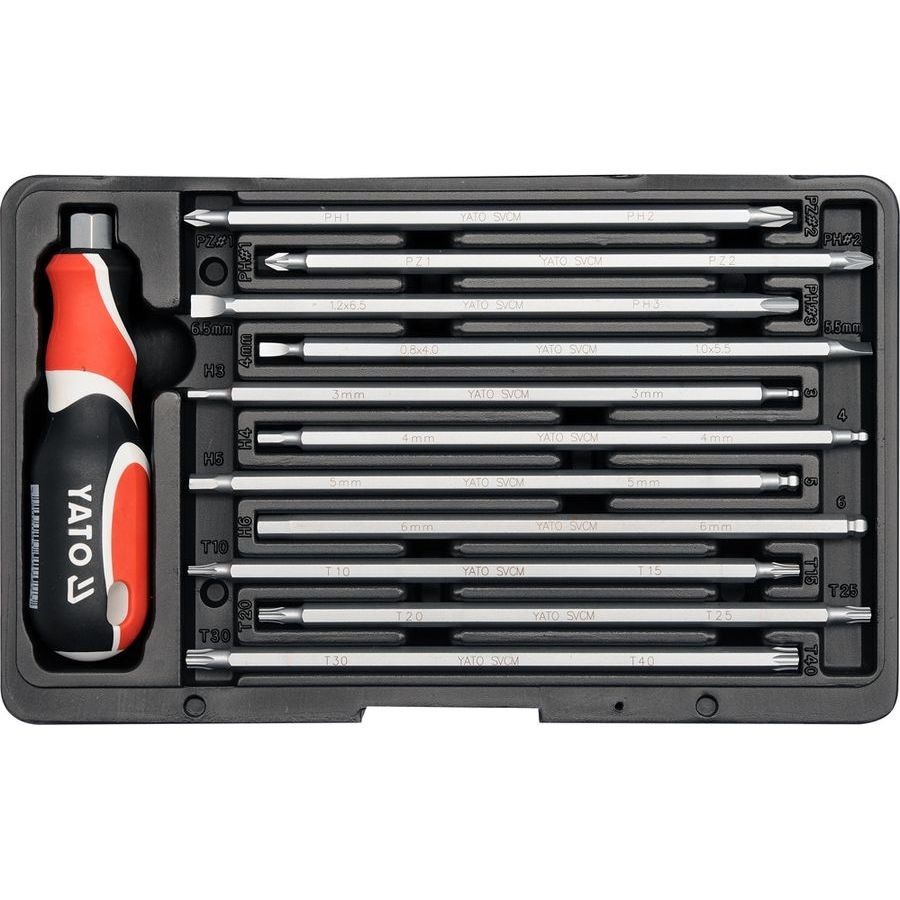 YATO Interchangeable Screwdriver's set 22 in 1 is an ideal tool for quick screwdrivers change. The set includes extendable screwdriver handle with soft grip handle, which is very easy to operate with. The set includes 12 pieces of double ended screwdriver bits, which are manufactured from highest quality alloy steel SVCM55. The length of bits is 115mm, the length of set 175mm.