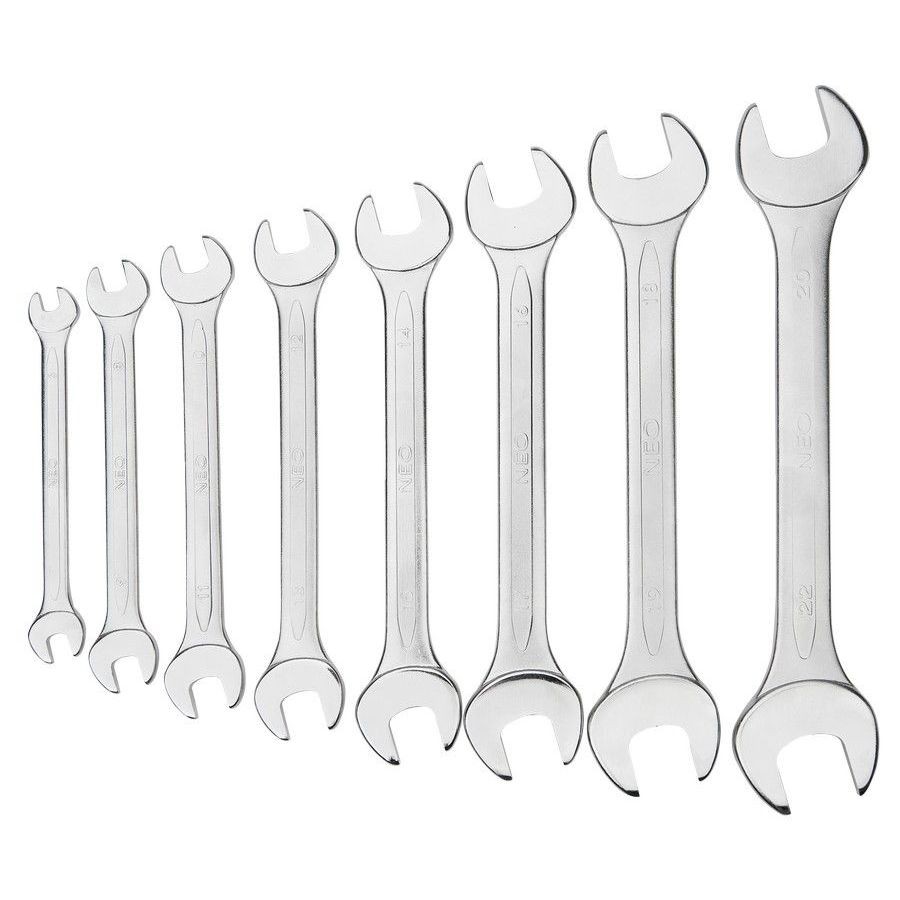 NEO set of double open end spanners includes spanners in common sizes, factory-made in accordance with DIN 3110. top quality metallic element alloy steel guarantees sturdiness for years of spanners use. Tools square measure delivered in practical case with written spanner sizes that makes it easier to stay them in order. Tool quality confirmed with TÜV certificate and twenty five years manufacturer`s warranty.