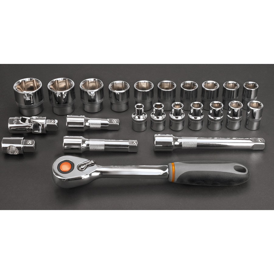 NEO socket wrench set 1/2" includes 23 pieces made of high-quality chromium vanadium steel. The set includes ratchet with a durable ratchet mechanism (48 teeth). The set contains a wide range of sockets (sized from 8 to 32 mm). Additionally, the set is equipped with extension, joint and adaptor 1/2"M x 3/8"F.