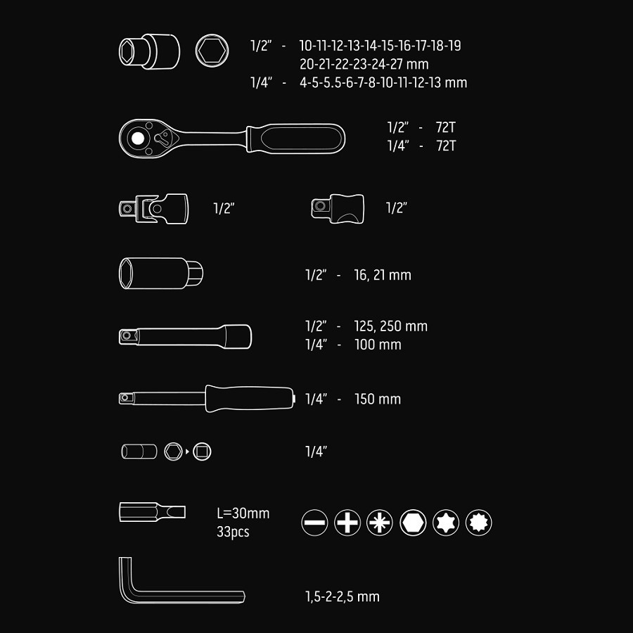 | 10 x hexagonal sockets 1/4”, sizes: 4, 5, 5.5, 6, 7, 8, 10, 12, 13 mm |