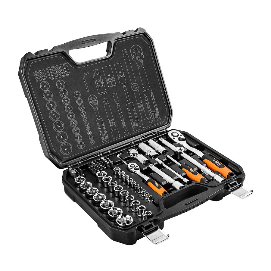 NEO socket wrench set 1/2" and 1/4" (ref. no. 08-673) includes 73 pieces made of high-quality chromium vanadium steel. The set includes 1/2" and 1/4" ratchets (durable ratchet mechanism with 72 teeth) with ergonomic offset handles. The set contains a wide range of hexagonal sockets with embossed information (sized 4 to 27 mm) and driver bits (flat, cross, hexagonal, Torx).