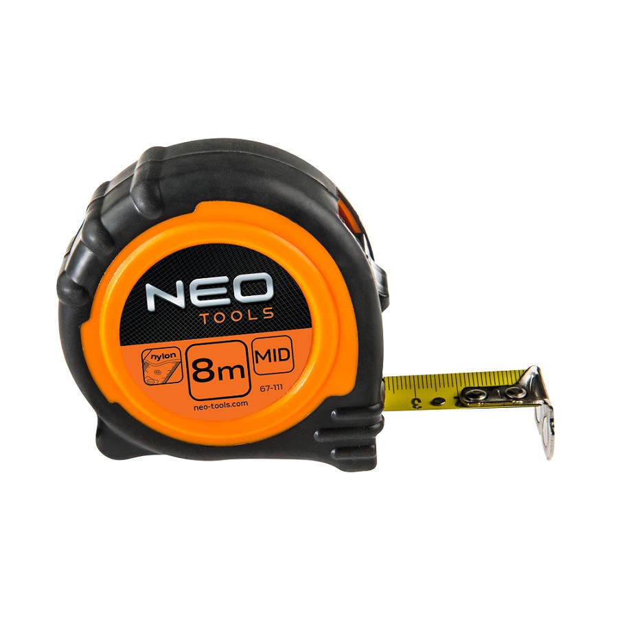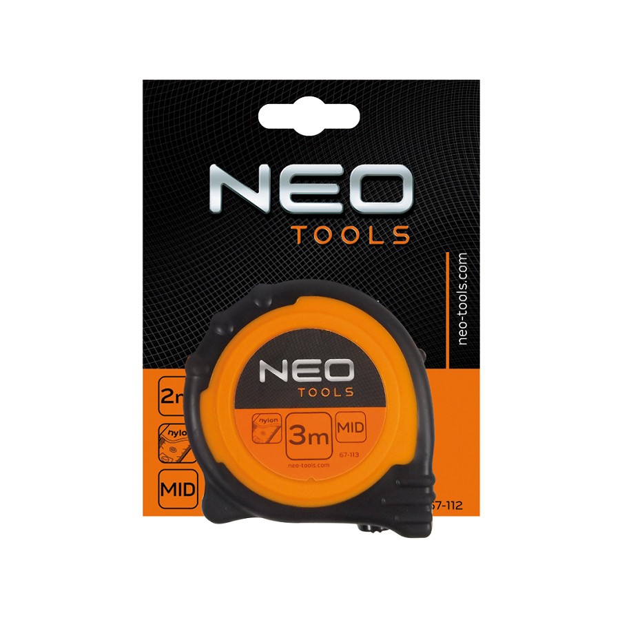NEO double sided steel pocket tape measure with two tape winding locks. Nylon coating of the tape protects printed scale against wearing off. Magnetic tip and tape profile are an aid in making measurements. Tape winding bumper protects the catch from breaking off. Tip strengthened with two rivets. Ergonomic casing shape allows firm and comfortable grip, and anti slip material ensures comfort and safety at work. Manufacturing process compliant with EU Measuring Instruments Directive guarantees product reliability.