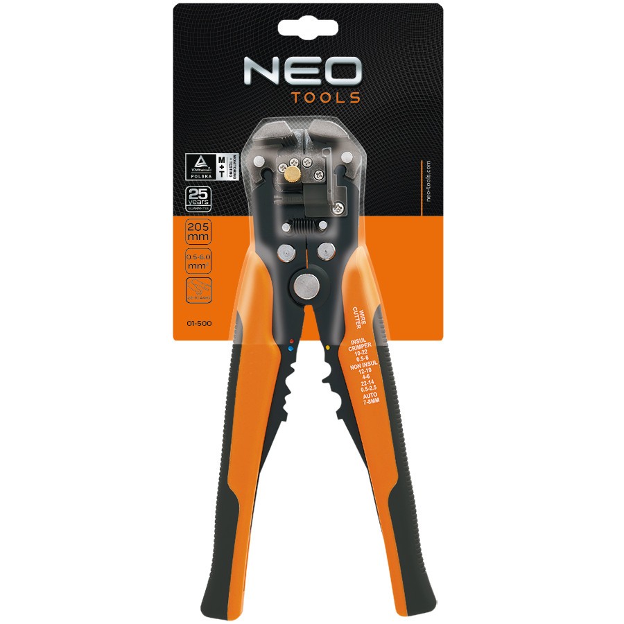 Automatic NEO wire stripper sized 205 mm. Used for stripping and crimping jobs. Working range between 0.2 and 6 mm2, for crimping terminals 1.5 to 6 mm2. Jaws are made of exceptionally durable steel with hardness 52-57 HRC, which guarantees many years of tool life. Two material ergonomic handle improves the comfort of work. Tool quality confirmed with TÜV certificate and 25 years manufacturer's warranty.