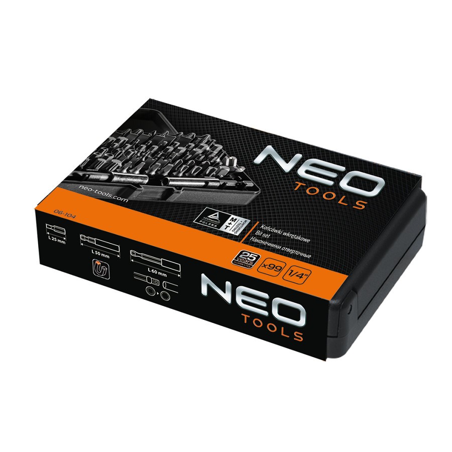 NEO set of 1/4" driver bits includes 99 pieces. Thanks to the usage of S2 alloy steel, the hardness of driver bits is 60 HRC, which substantially improves lifetime and quality of work. The set features a wide range of standard and special driver bits with 25 mm length. The set also includes bit adapters and hook holder. TÜV Rheinland certificate guarantees high quality and reliability of the product.
