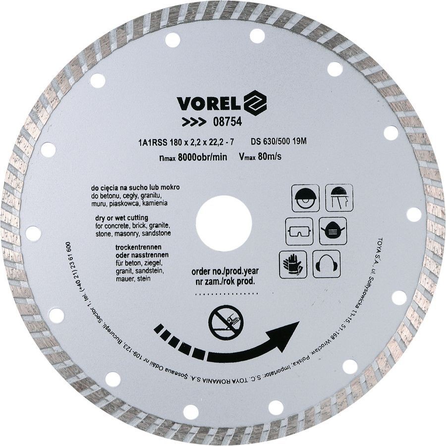 VOREL Turbo diamond disc allows for efficient cutting concrete, reinforced concrete, marble, stone, brick etc. VOREL brand offers power tool and accessories assortment for all DIY enthusiasts.