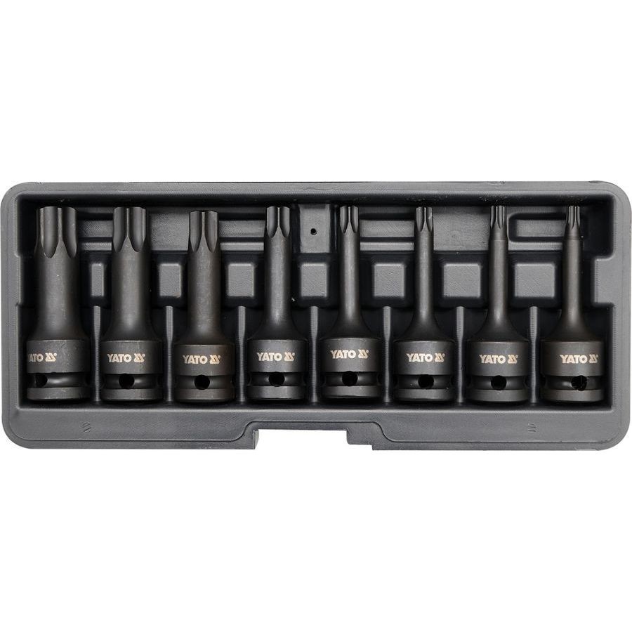 YATO Impact Bit Socket Set Torx T30-T80 1/2" 8 pieces made from highest quality chrome steel, which extends it life-cycle and ensures it can be used for longer. It has been tempered and hardened, which increased its strength and further make it corrosion resistant. An essential socket set in every garage. Supplied with a durable case for easy storage and transportation.